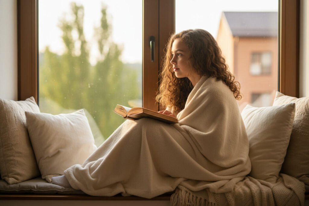 A woman sitting at a window holding a cup of tea, looking outside with a thoughtful and reflective expression in soft morning light